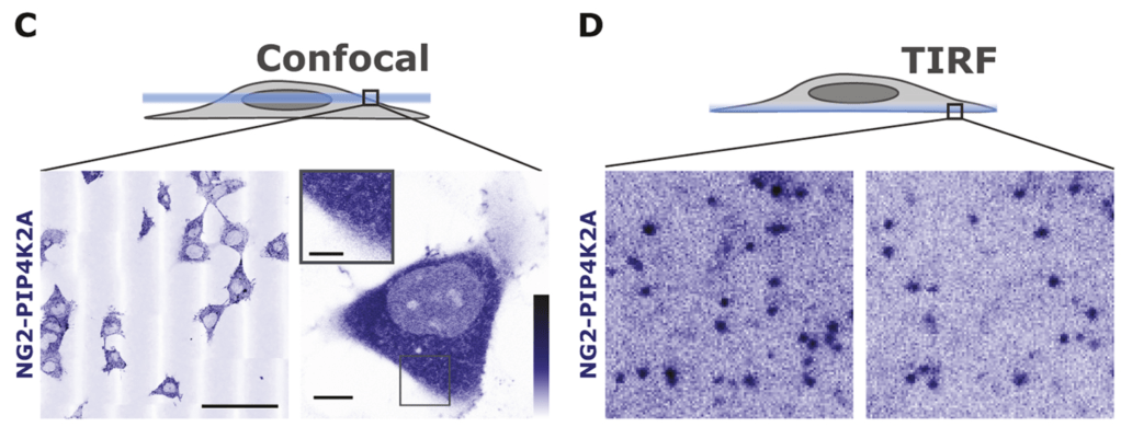 Rachel attached fluorescent protein tags to the PIP4K enzymes. Most of the protein is floating around in the cytoplasm, but if you look carefully at the bottom of the cell, you can see individual fluorescent molecules stuck to the membrane: