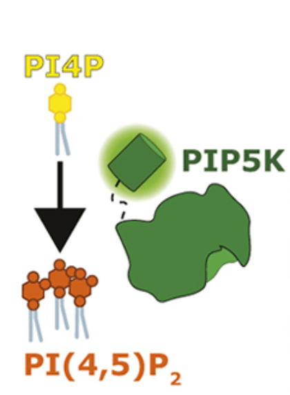 We’ve known the identity of this PIP5K enzyme for nearly four decades. Its a very active enzyme and does a great job of converting PI4P into PIP2. But, like our thermostat, how is it turned off when the cell has enough PIP2? That’s a pretty important question actually, because we know two things: firstly, it doesn’t run out of PI4P “fuel”, because cells maintain plenty of this lipid in their plasma membranes. Secondly, we know of diseases where cells accumulate too much PIP2. This leads to a host of diseases from kidney failure to neurodegeneration.