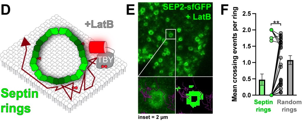 We could test this using a really freaky but cool trick: if you disassemble the cellular F-actin skeleton with a poison, the septin filaments rearrange into micrometer-sized rings – kind of tiny donuts. We could see the lipid biosensors bouncing around the outside of these, but almost never getting inside: